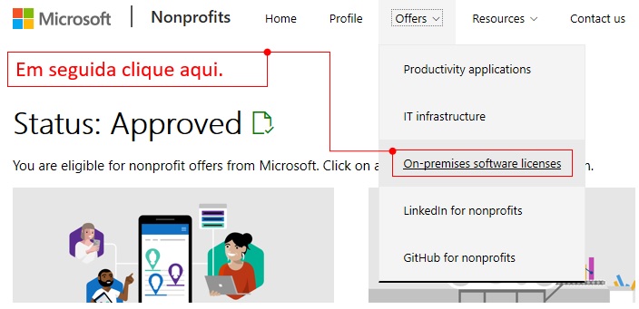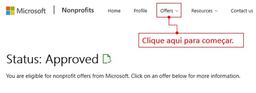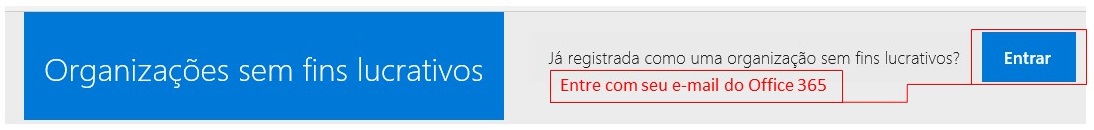 Para receber produtos da Microsoft com desconto, você deve primeiro registrar sua organização no portal para organizações sem fins lucrativos da Microsoft. Em seguida, você deverá enviar à TechSoup Brasil um certificado que valida a qualificação da sua organização para o Programa de Descontos. Este certificado terá validade de um ano. Nenhum certificado será necessário se a sua organização estiver solicitando apenas licenças de softwares do Programa de Doações da Microsoft. Veja abaixo o “passo a passo” para o registro e a emissão do certificado de sua organização: Caso sua organização já esteja registrada, pule para a PASSO DOIS. PASSO UM: Registre-se no portal para organizações sem fins lucrativos. 1. Acesse o portal para organizações sem fins lucrativos. 2. Siga as instruções para se registrar. Dentro de até 20 dias úteis, você deve receber um email com suas informações de elegibilidade. PASSO DOIS: Envie seu certificado de elegibilidade para a TechSoup Brasil. 1. Depois que sua qualificação for confirmada, retorne ao portal para organizações sem fins lucrativos da Microsoft e clique em "ENTRAR", na parte superior da página. Caso seja solicitado, forneça o Código de Validação (Token) criado no site da TechSoup Brasil.