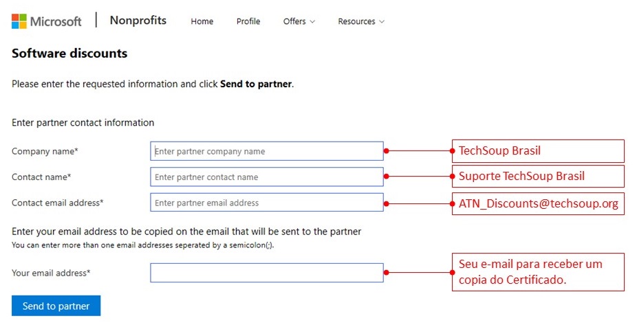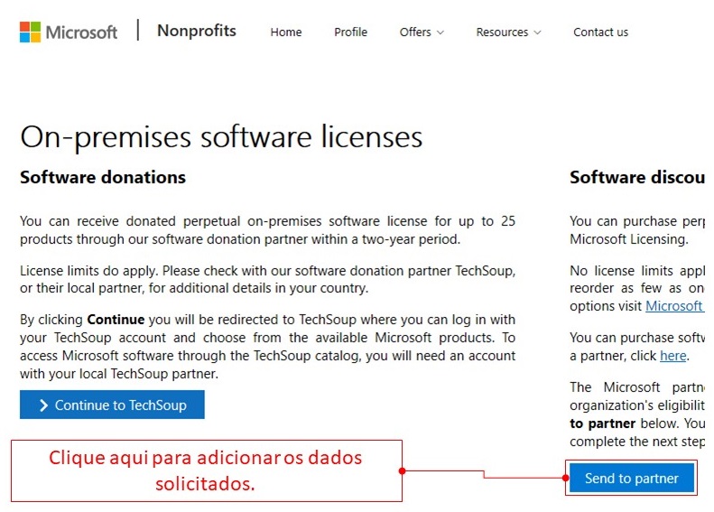 4.Nesta tela seguient, clique em 'SEND TO PARTNER', para adicionar os dados relativos ao parceiro TechSoup.