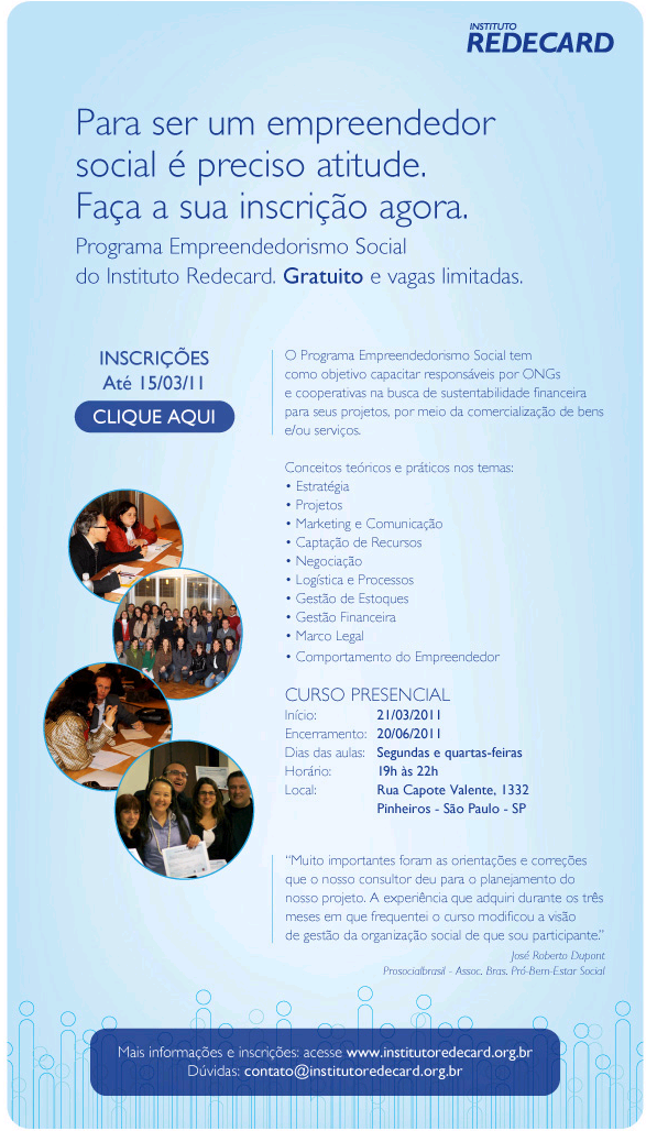 O curso ofertado pelo Instituto Redecard é gratuito, e terá 3 meses de duração. Os módulos a serem trabalhados incluem temas como: Estratégia, Projetos, Marketing e Comunicação, Captação de Recursos, Negociação, Logística e Processos, Gestão de Estoques, Gestão Financeira, Marco Legal e Comportamento do Empreendedor. A TechSoup Brasil possibilitará uma continuidade do curso no ambiente virtual.