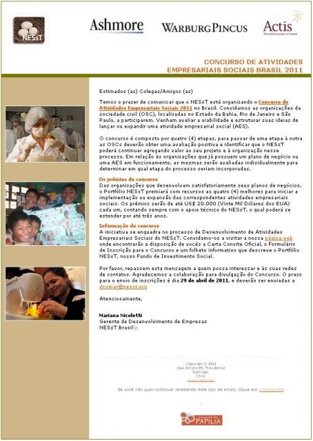 O NESsT Brazil está anunciando o lançamento do Terceiro Concurso de Atividades Empresariais Sociais no Brasil nesta sexta-feira, dia 18 de Março. Organizações da Sociedade Civil (OSC) localizadas em São Paulo, Rio de Janeiro e Bahia que tenham idéias de atividades sociais empresariais (AES) que contribuam para a sustentabilidade organizacional, ou que já as tenham em funcionamento, estão convidadas a participar dessa empreitada. O convite é para que recebam apoio no planejamento de seus negócios sociais, começando pela preparação da organização, chegando ao plano de negócio. As organizações bem sucedidas nessa primeira etapa receberão apoio para a implementação ou consolidação de sua atividade empresarial social (AES). O prêmio pode chegar a US$20.000,00 por organização, os vencedores serão convidados a participar do Portifólio NESsT e receberão apoio técnico e gerencial suporte por até três anos. Para obter a Carta Convite Oficial, o Formulário de Inscrição ou mais informações sobre o concurso, clique na imagem abaixo: